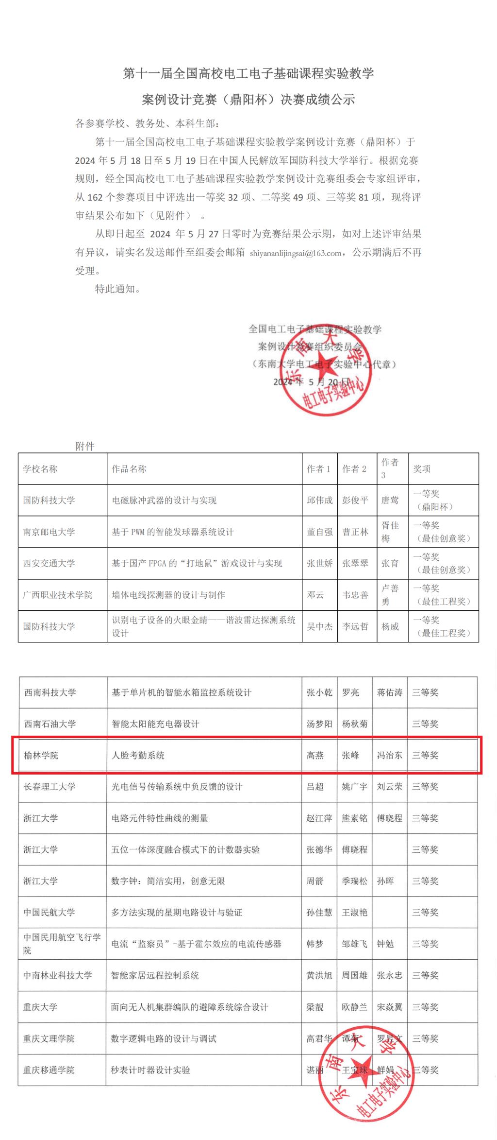 2024年5月17日-19日,第十一届全国高校电工电子基础课程实验教学案例设计竞赛决赛在中国人民解放军国防科技大学落下帷幕。公司英国365集团公司官网高燕、张峰、冯治东教师团队参赛项目“人脸考勤系统”实验教学案例在西部赛区比赛中获得一等奖,并代表西部赛区参加国赛,获得国赛三等奖。