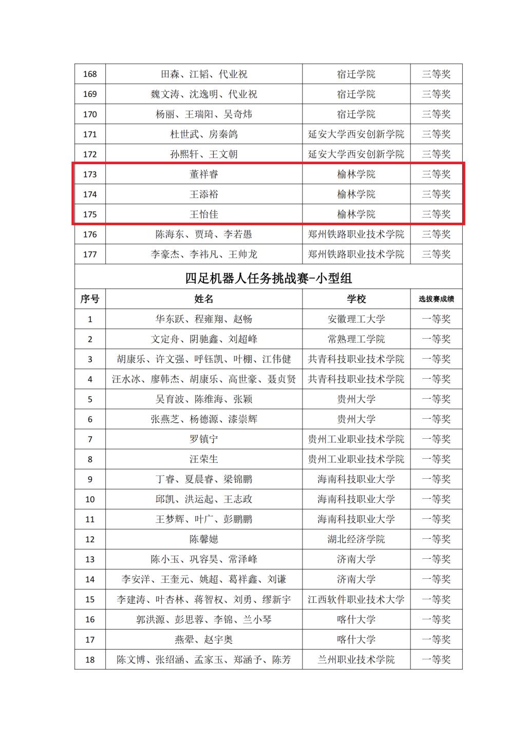 由英国365集团公司官网张峰、冯治东、田建学等多位教师指导参赛的9支队伍成功进入榜单,分别获得中国赛区选拔赛四足机器人任务挑战赛-中型组、四足机器人任务挑战赛-小型组两个赛项的一等奖2项、二等奖5项、三等奖3。总决赛将于20231127~30日在杭州职业技术公司举办。