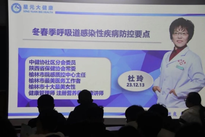 讲座主讲人是榆林市院感质控中心主任、星元医院经理助理兼健康管理中心主任杜玲主任,她也是国内知名的健康管理专家、国家感控学组委员,榆林市营养学会名誉理事长,陕西省医院等级评审专家。曾获陕西省医院感染管理先进个人,榆林市最美医务工作者。创办星元健康大讲堂,组织健康教育讲座300多场,受众20余万人,参与编写国家级医院感染管理专著3部,发表论文20余篇章。
