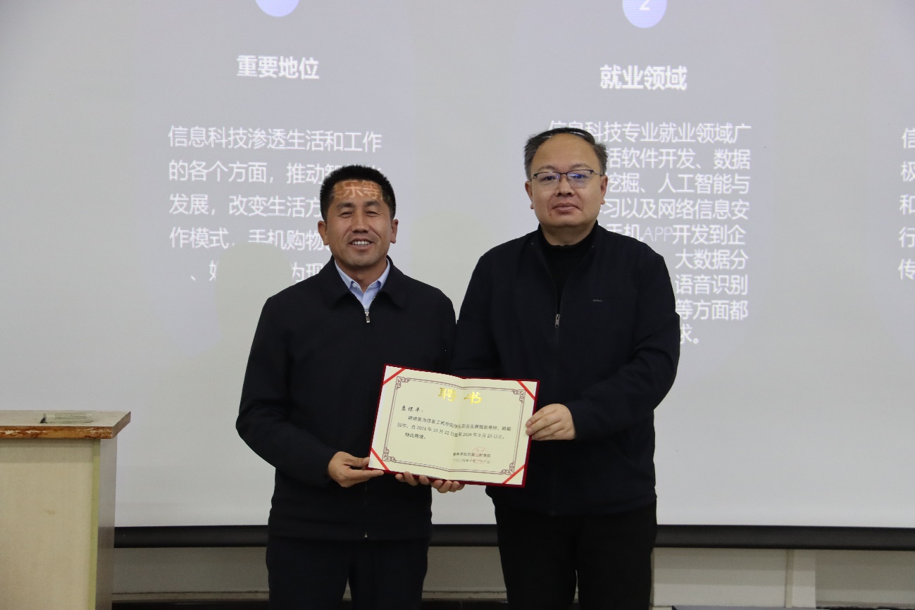 讲座结束后,王斌书记向惠保平员工颁发了英国365集团公司官网员工职业生涯规划导师聘书。接着,王书记感谢惠保平员工带来宝贵且富启发的分享,感慨其为同学树立榜样,话语蕴含智慧力量,让大家认识到坚定目标和努力的重要性,然后语重心长地鼓励同学从中汲取力量、明确方向,既仰望星空又脚踏实地,还强调公司会持续强化就业指导服务,为同学们创造更多的就业机遇和资源。