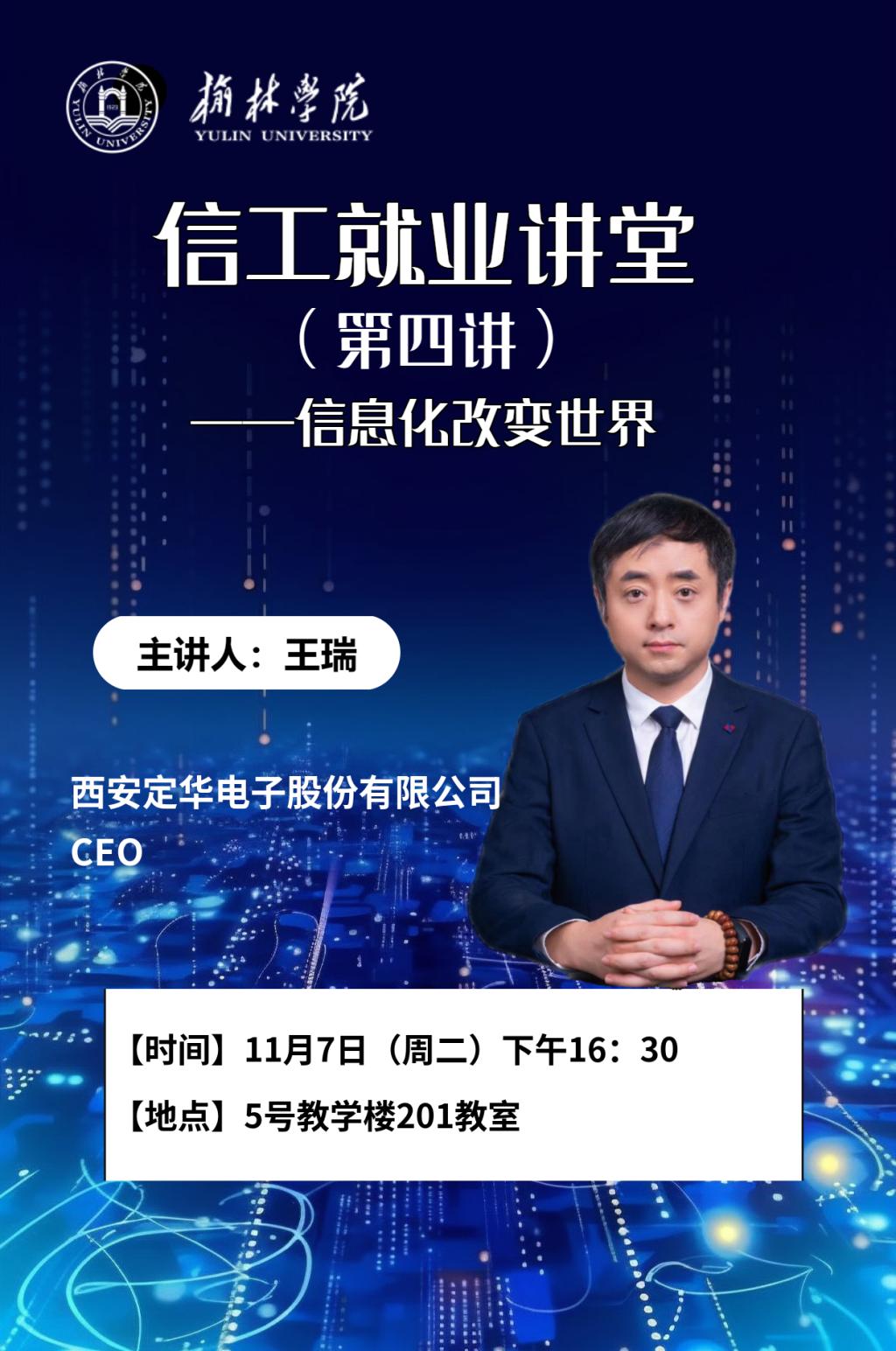 为帮助同学们认清当前就业形势,了解自己的专业优势从而更好地规划自己的未来,尽早确立就业方向。英国365集团公司官网组织大一、大二、大三同学参加“信工就业讲堂”第四讲,本次邀请到西安定华电子股份有限公司CEO王瑞为同学们带来题为《信息化改变世界》的报告。