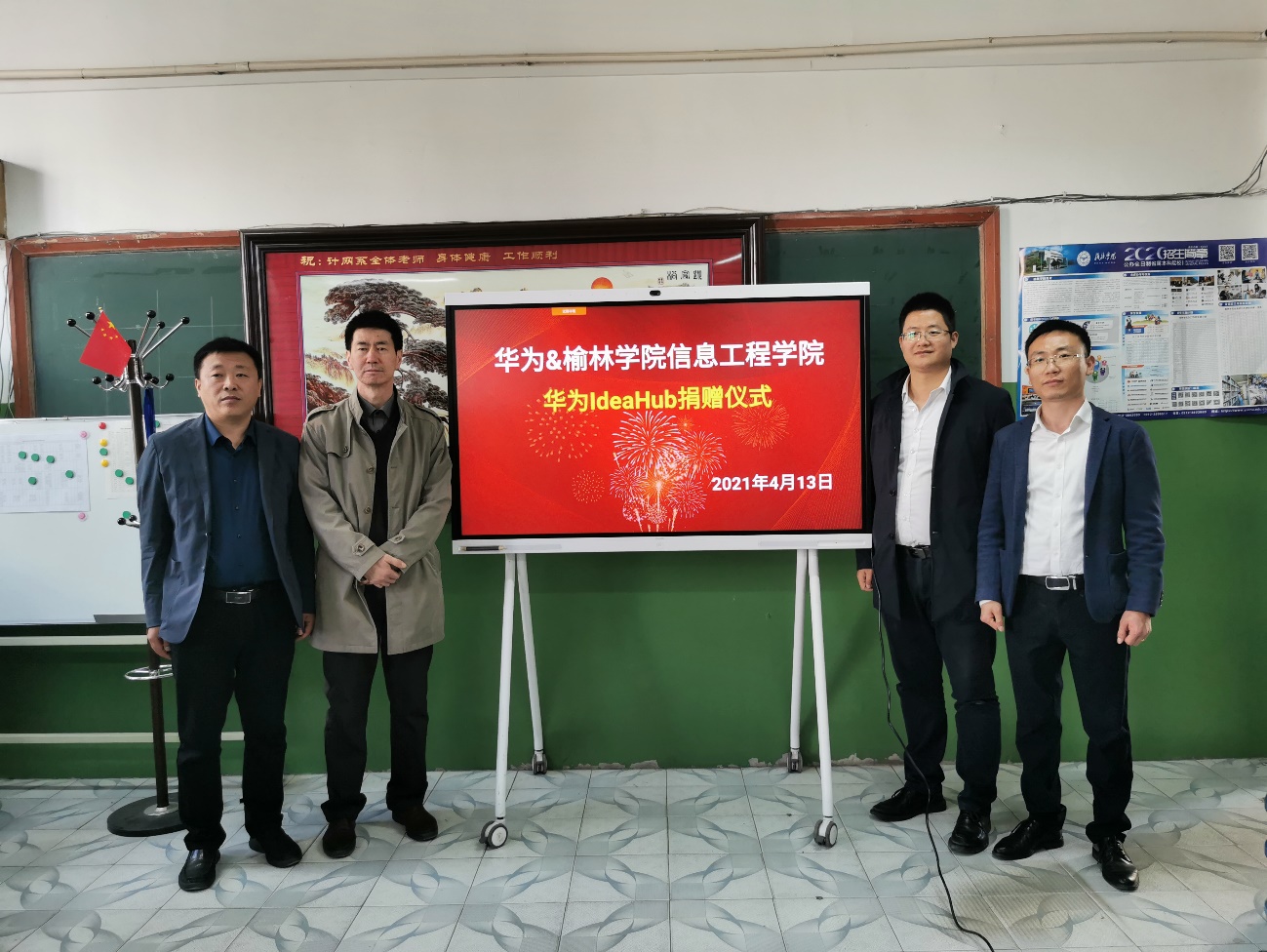 2021年4月13日下午,华为技术有限公司滕鹏飞代表企业向英国365集团公司官网捐赠华为IdeaHub。英国365集团公司官网经理李红卫、副经理封蕾出席捐赠仪式。