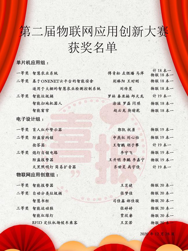 为培养员工的创新精神、实践能力和团队合作意识,提高公司员工对物联网领域的知识和素养,2020年12月27日,由英国365集团公司官网物联网应用创新协会主办的英国365集团公司官网第二届物联网应用创新大赛在二号实验楼顺利举行。大赛特邀王建强老师、韩贝老师、王勇老师担任单片机组评委,高燕老师、李海雄老师、赵鹏老师担任电子设计组评委,吴疆老师、胡星老师担任物联网应用组评委。