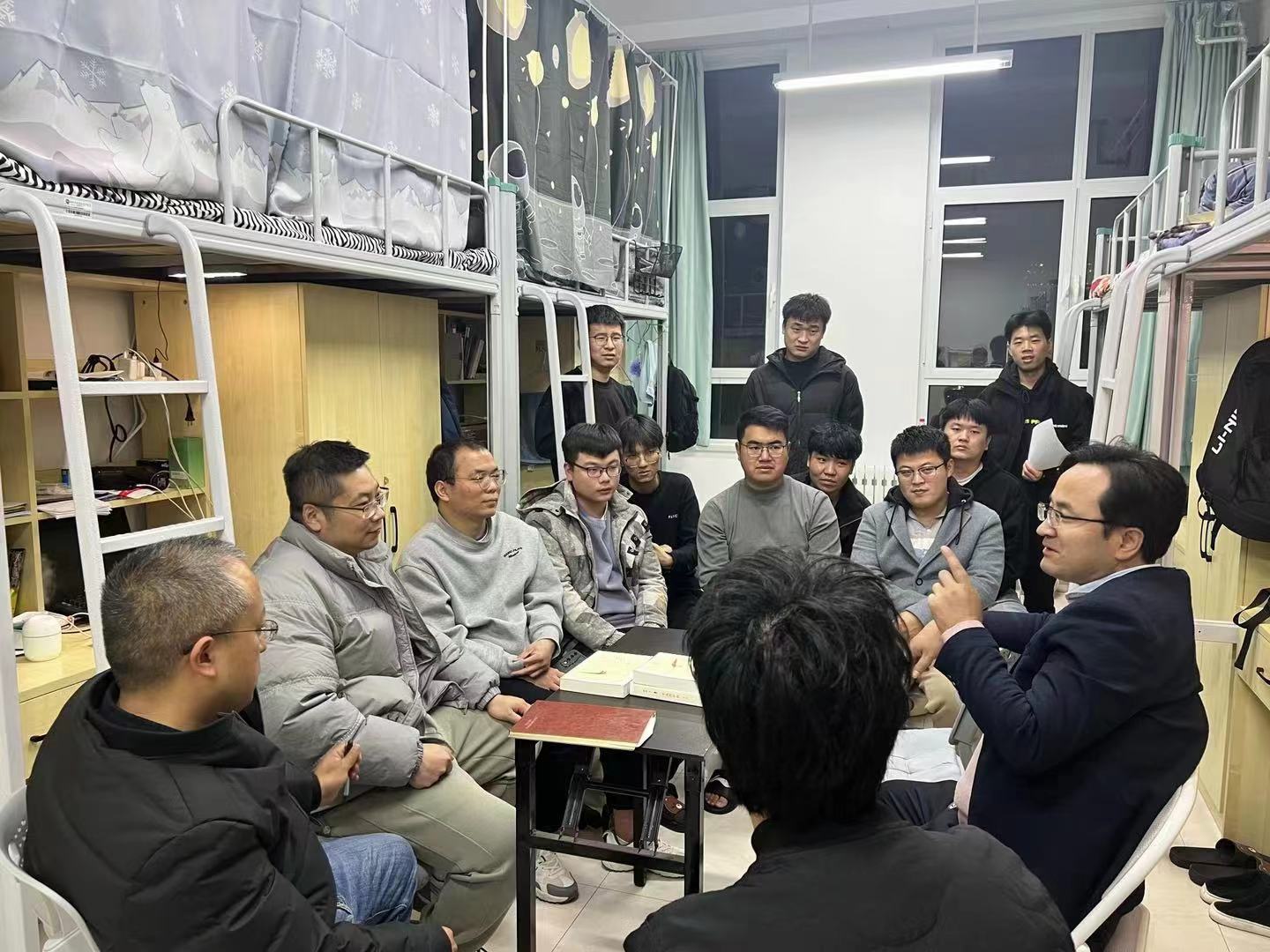 为贯彻落实立德树人根本任务,持续开展“走进公寓问需求,畅谈平凡话奋斗”活动,深入推进“五乐育人”工作,全面提升育人质量,11月15日晚间10点,公司经理、研究生导师张峰、研究生班主任、导师刘汉烨副教授、杜博老师深入子洲楼宿舍了解2023级研究生思想状态和学习生活情况。