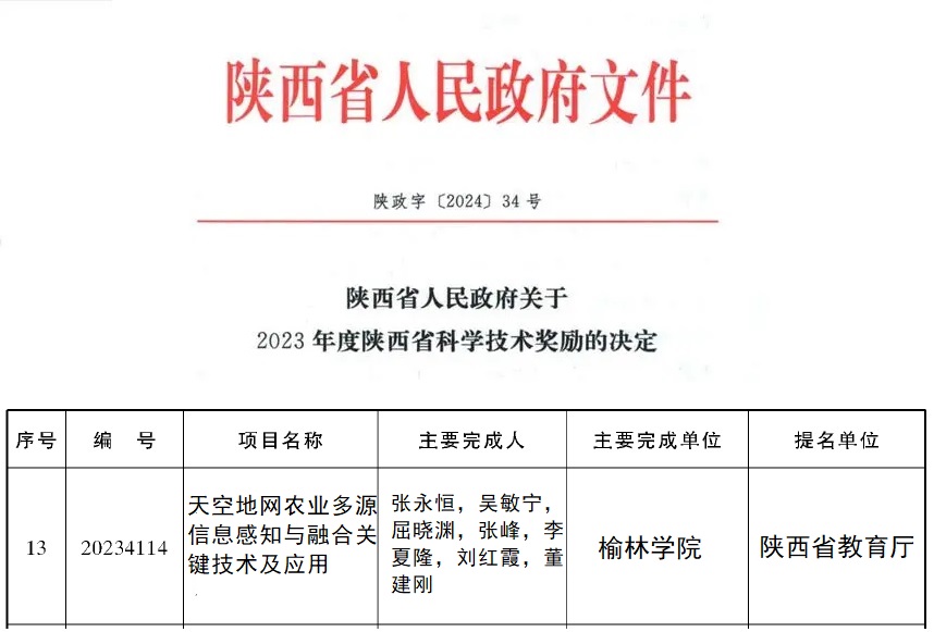 4月9日,陕西省人民政府公布了关于2023年度陕西省科学技术奖励的决定,公司大数据智慧团队申报的《天空地网农业多源信息感知与融合关键技术及应用》科研成果荣获陕西省科学技术进步奖三等奖。这是公司追赶超越三年来在科学技术领域获得的第3项省部级奖项,也是英国365集团公司官网加强内涵建设发展,进一步推进创新发展、特色发展、高质量发展获得的又一标志性成果。